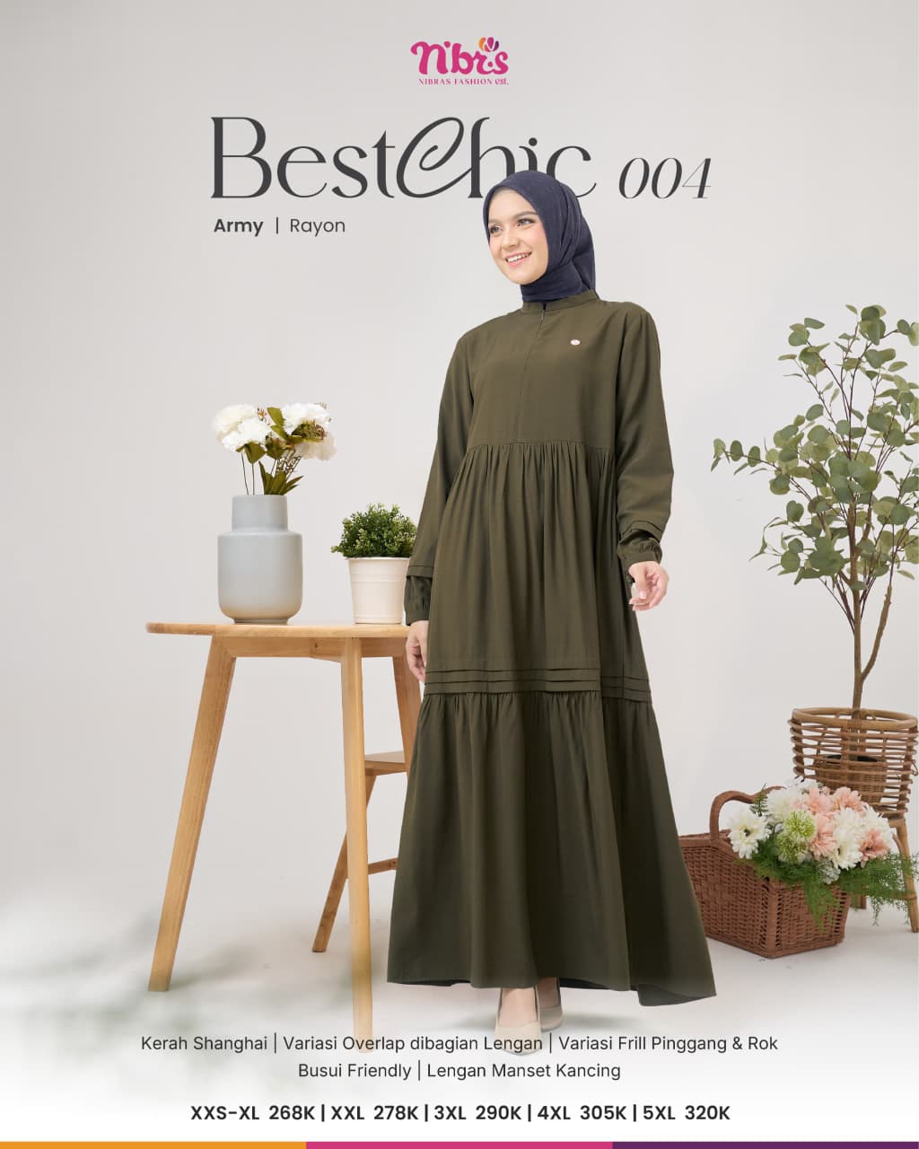 Gamis BESTCHIC 004 menggunakan bahan Rayon yang dikenal lembut, halus, dan menyerap keringat, sangat idel untuk iklim tropis serta cuaca panas. Gamis BESTCHIC 004 dilengkapi dengan kerah Shanghai, variasi overlap dibagian lengan, variasi frill dibagian pinggang & rok, serta lengan manset kancing. Gamis BESTCHIC 004 juga sudah busui friendly loh!