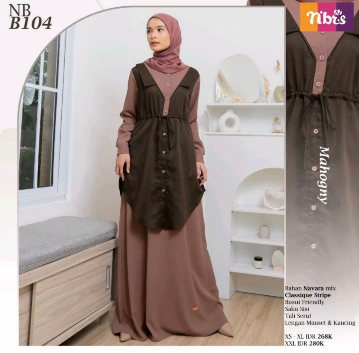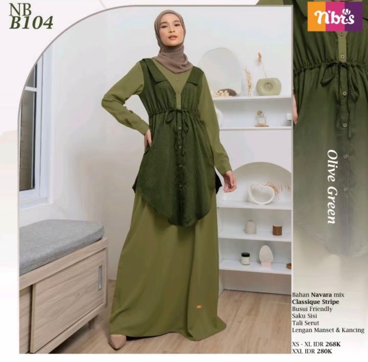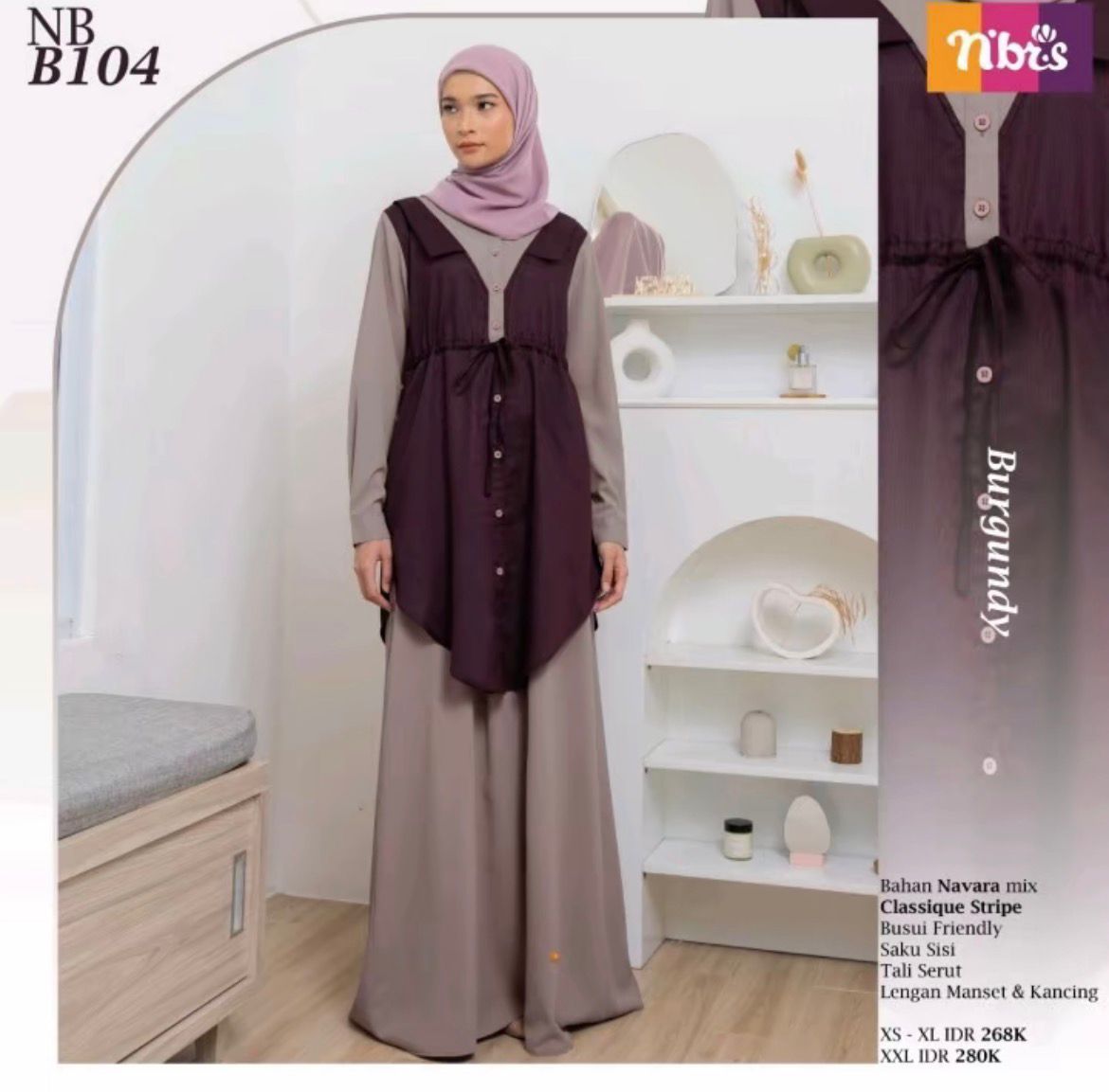 N'BRS menghadirkan kesan cantik dan unik melalui gamis terbaru NB B104 yang menawarkan konsep 2 looks in 1. Gamis ini memadukan dua material berkualitas, yaitu bahan Navara dan Classique Stripe. Material Navara dikenal memiliki tekstur dengan tampilan seperti anyaman, terasa lembut, halus, flowy, serta bersifat breathable, sehingga nyaman digunakan. Sementara itu, material Classique Stripe hadir dengan karakter kain yang halus, lembut, jatuh, dan memberikan kesan mewah. Ditambah dengan detail kerah dan tali pinggang, tampilanmu akan semakin manis dan anggun saat mengenakan gamis cantik dari N'BRS ini.