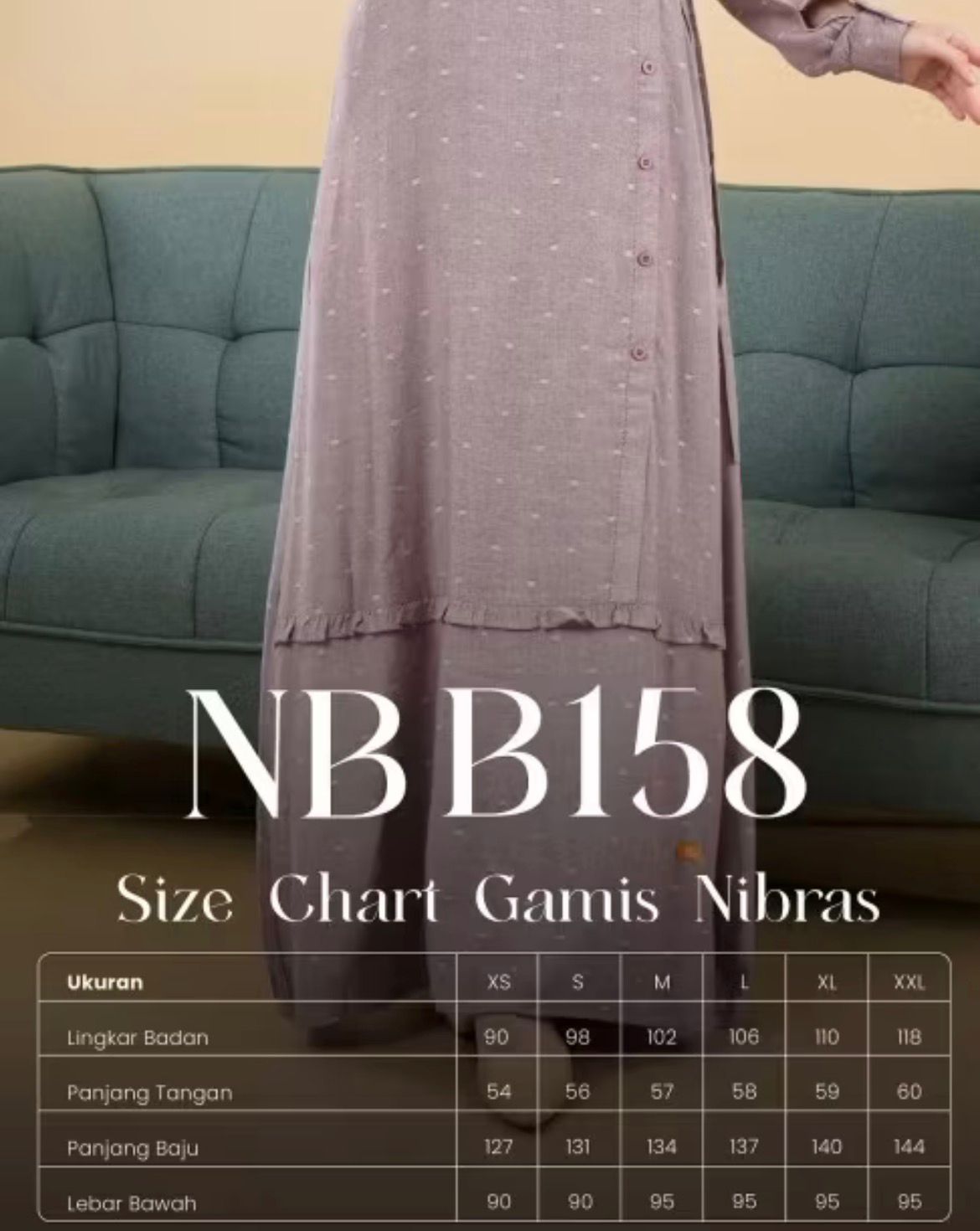 Gamis NB B158 terbuat dari bahan Dobby Rayon yang ringan, adem, dan jatuh dengan tekstur dobby lembut yang memberi kesan simpel namun elegan. Desainnya busui friendly dengan deretan kancing samping yang unik, dilengkapi tali adjustable di bagian pinggang, saku sisi yang praktis, serta lengan manset berkancing yang memudahkan saat berwudhu. Bagian bawahnya memiliki variasi frill yang membuat tampilan lebih manis dan anggun. Gamis ini cocok dipakai untuk kegiatan harian maupun acara casual dengan tetap menjaga kenyamanan dan keanggunan penggunanya.
